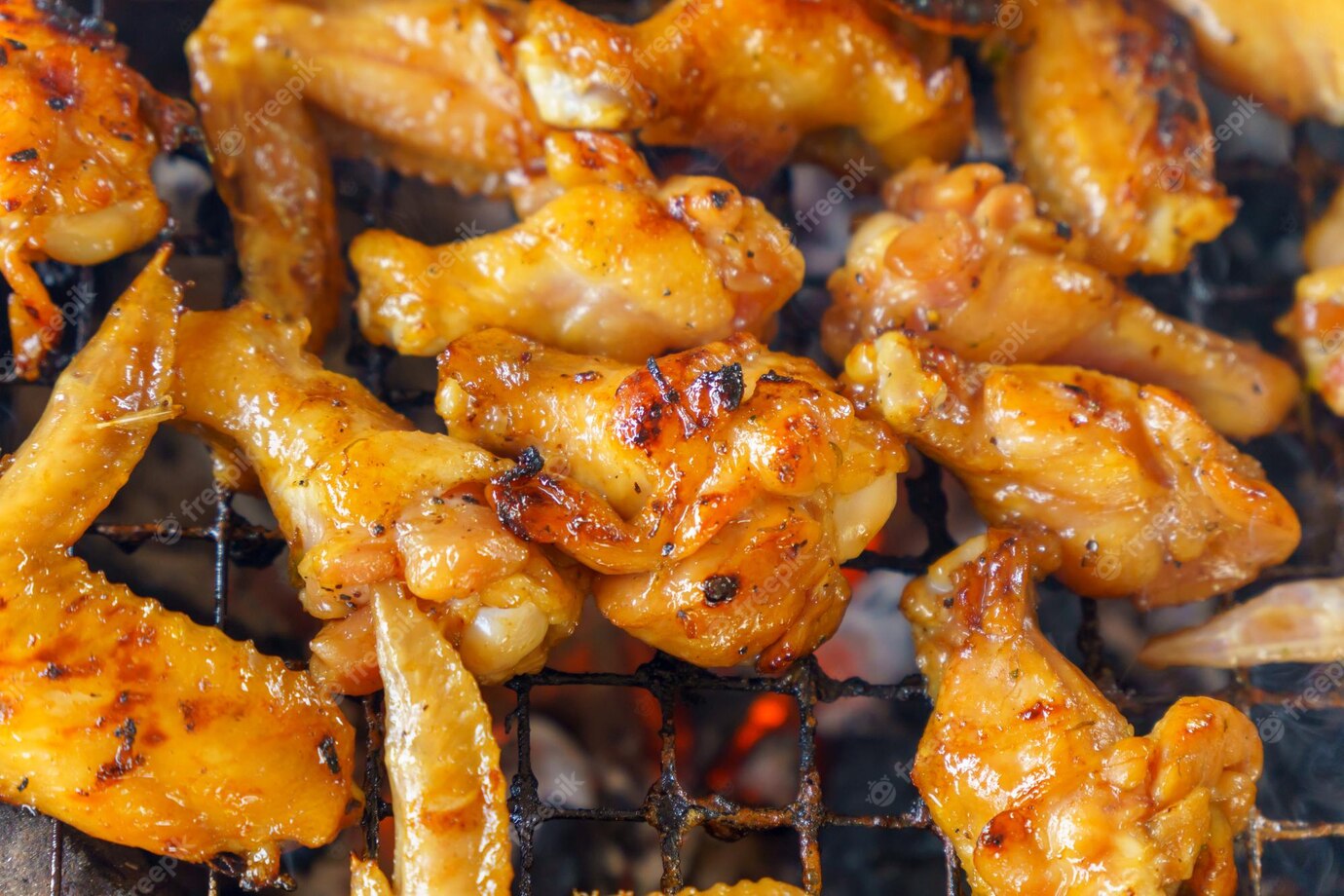 If using a gas barbecue or an indoor grill, preheat to medium (350°F). If using charcoal or wood, prepare a fire. Drain the chicken and reserve the marinade. When the gas barbecue or indoor grill is preheated or the coals or wood are ash covered, brush the grill with oil, then add the chicken wings. Regulate the heat so that it remains at a medium temperature. Grill the chicken wings for about 30 minutes with the barbecue cov-ered. Turn the wings every 5 minutes, basting them on both sides with the reserved marinade. The chicken wings are done when the skin turns an even mahogany color and the meat is tender.